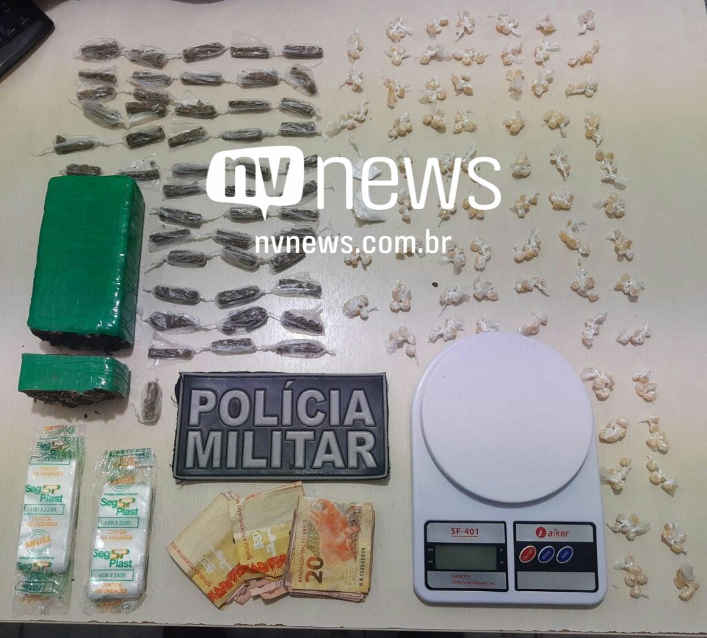 Dessa forma, os militares foram até o local, onde apreenderam 59 buchas de maconha, um tablete de 500g da mesma substância, 332 pedras de crack, dois papelotes de cocaína, uma balança de precisão, um caderno contendo informações acerca do tráfico de drogas, R$ 310,00, em espécie.