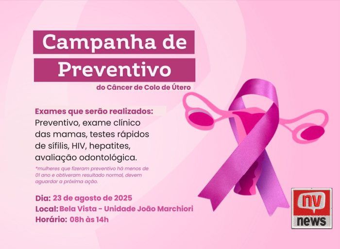 A ação acontecerá na Unidade de Saúde João Marchiori, em Bela Vista, das 8h às 14h, com atendimento voltado ao cuidado integral da mulher. Além do exame preventivo, também serão realizados exame clínico das mamas, testes rápidos de sífilis, HIV e hepatites, além de avaliação odontológica.