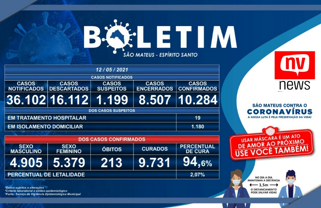 O Município chegou a 10.284 casos confirmados nesta quarta-feira (12). Ao todo, São Mateus tem 36.102 casos notificados, destes 16.112 foram descartados, 1.199 são suspeitos em investigação, 8.507 foram encerrados, 9.731 foram curados e há 213 óbitos confirmados. O percentual de cura do Município é de 94,6% e o percentual de letalidade é de 2,07%.