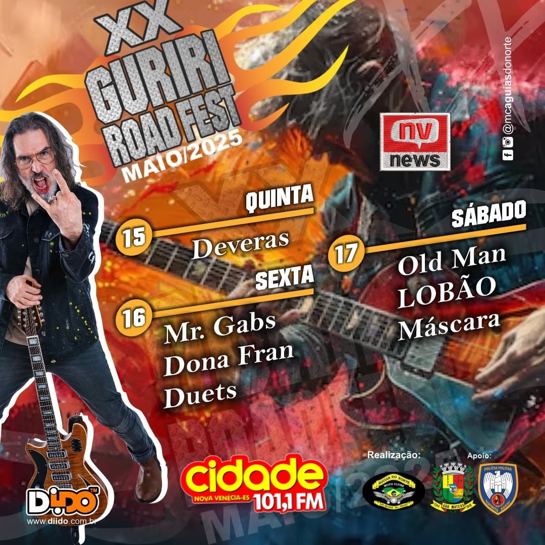 A contagem regressiva já começou! Entre os dias 15 e 17 de maio, o balneário de Guriri, em São Mateus, será novamente invadido por roncos de motores, couro, liberdade e muito rock and roll, durante a realização da 20ª edição do Guriri Road Fest — evento organizado pelo tradicional Moto Club Águias do Norte.