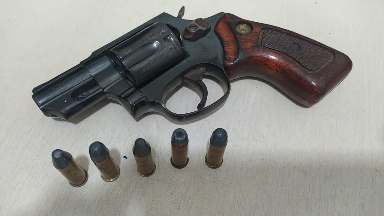 Nas buscas os militares que atendiam a ocorrência lograram êxito em localizar com o condutor um revólver calibre .38, com 05 munições do mesmo calibre intactas.