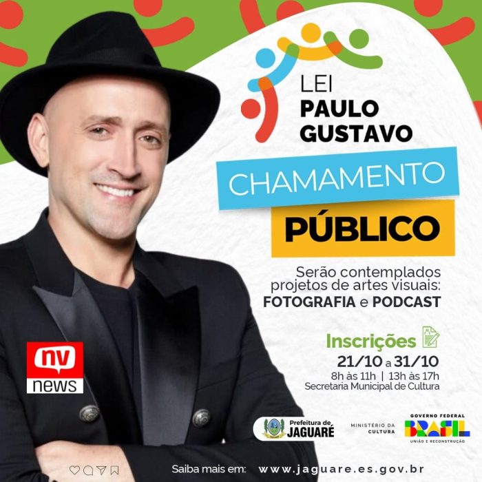 A Secretaria Municipal de Cultura de Jaguaré divulgou nesta sexta-feira, 18, edital de fomento à cultura com seleção de projetos da Lei Paulo Gustavo, no município. A publicação do novo edital para seleção de projetos será para as categorias de Fotografia e Podcast. Nesta quinta, 17, a Secretaria também anunciou recursos da Política Nacional Aldir Blanc de Fomento à Cultura (PNAB2).