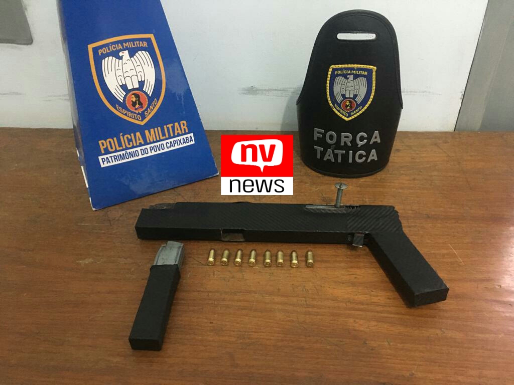 Os policiais realizaram buscas em um terreno próximo ao local onde os suspeitos estavam e localizaram uma submetralhadora de fabricação artesanal, municiada com oito munições calibre .380.