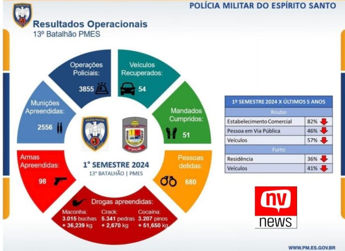 Além disso, apenas no primeiro semestre de 2024, o 13º Batalhão apreendeu 98 armas de fogo, 2.556 munições, mais de 90 kg de drogas, prendeu 680 indivíduos que infringiram a lei, deteve 51 indivíduos com mandados de prisão e recuperou 54 veículos.