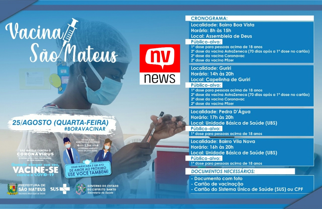 Nesta quarta-feira (25) a Secretaria Municipal de Saúde continua a vacinação contra Covid-19 com a aplicação da 1ª dose nas pessoas acima de 18 anos. As equipes também seguem com a aplicação da 2ª dose das vacinas AstraZeneca, Coronavac e Pfizer. Para ser imunizado, basta levar um documento com foto, Cartão de Vacinação, Cartão do Sistema Único de Saúde (SUS) ou CPF.