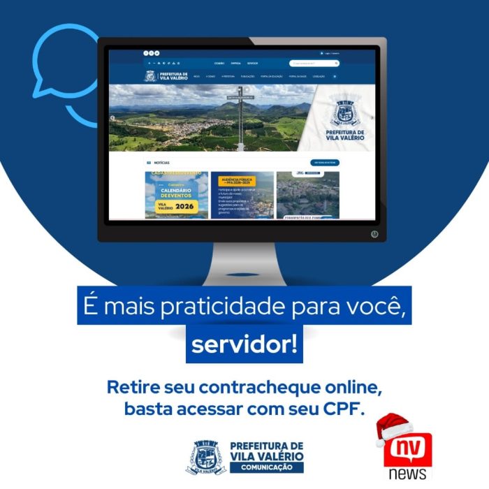 A Prefeitura de Vila Valério informa que os servidores públicos municipais já podem acessar o contracheque de forma online, por meio do site oficial do município, garantindo mais praticidade, transparência e agilidade no acesso às informações funcionais.