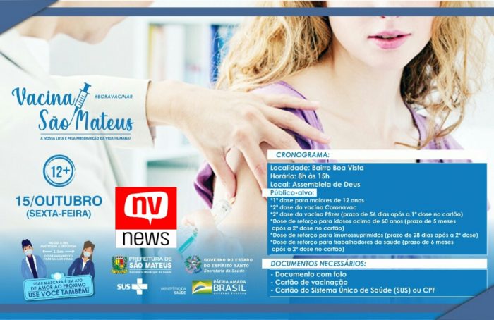 A Secretaria Municipal de Saúde continua, nesta sexta-feira (15), com a vacinação contra Covid. Haverá a aplicação da 1ª dose contra Covid para maiores de 12 anos. A imunização segue com a 2ª dose das vacinas Coronavac e Pfizer. Também tem a 3ª dose (dose de reforço) para trabalhadores da Saúde e idosos acima de 60 anos, com 5 meses de intervalo da 2ª dose. A vacinação de pessoas imunossuprimidas também segue no cronograma. Para ser imunizado, basta levar um documento com foto, Cartão de Vacinação, Cartão do Sistema Único de Saúde (SUS) ou CPF.