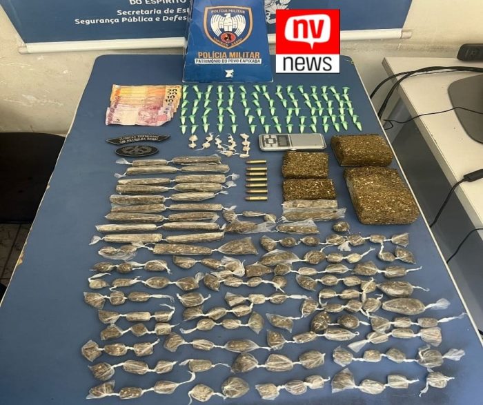 Na manhã de domingo (04), por volta das 11:20min, no bairro Porto, na cidade de São Mateus, durante patrulhamento preventivo os militares visualizaram um indivíduo que, ao perceber a presença policial, empreendeu fuga. Os militares conseguiram alcançá-lo e tiveram sucesso ao encontrar junto com ele em uma mochila preta. Ao revistarem a referida mochila, foram localizados 90 pinos de cocaína, 04 tabletes e 133 buchas de maconha, 19 pedras de crack, bem como uma balança de precisão e R$ 125,00 em espécie.